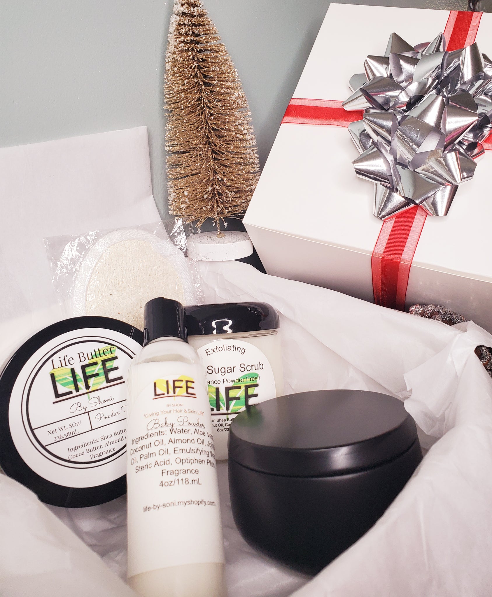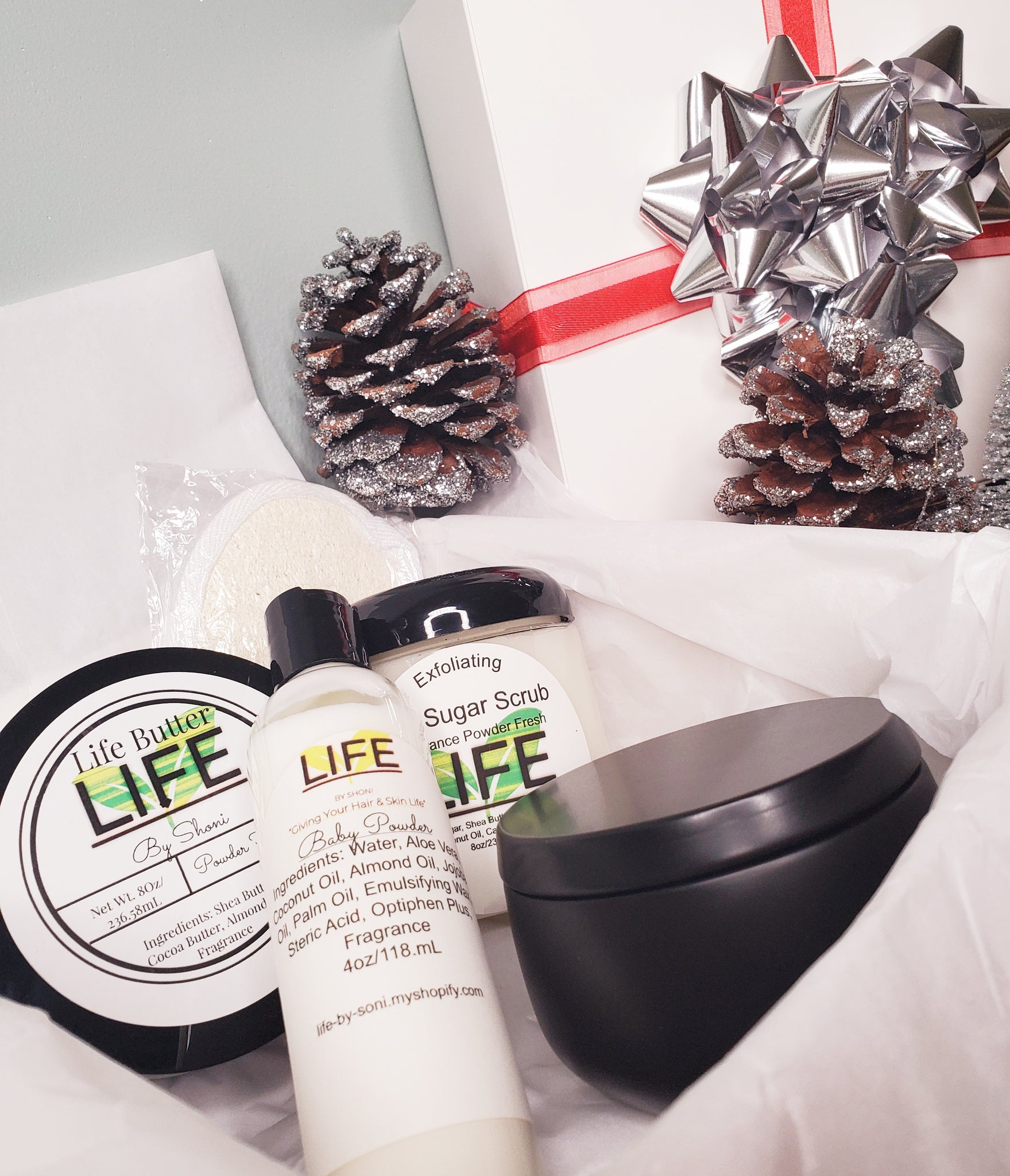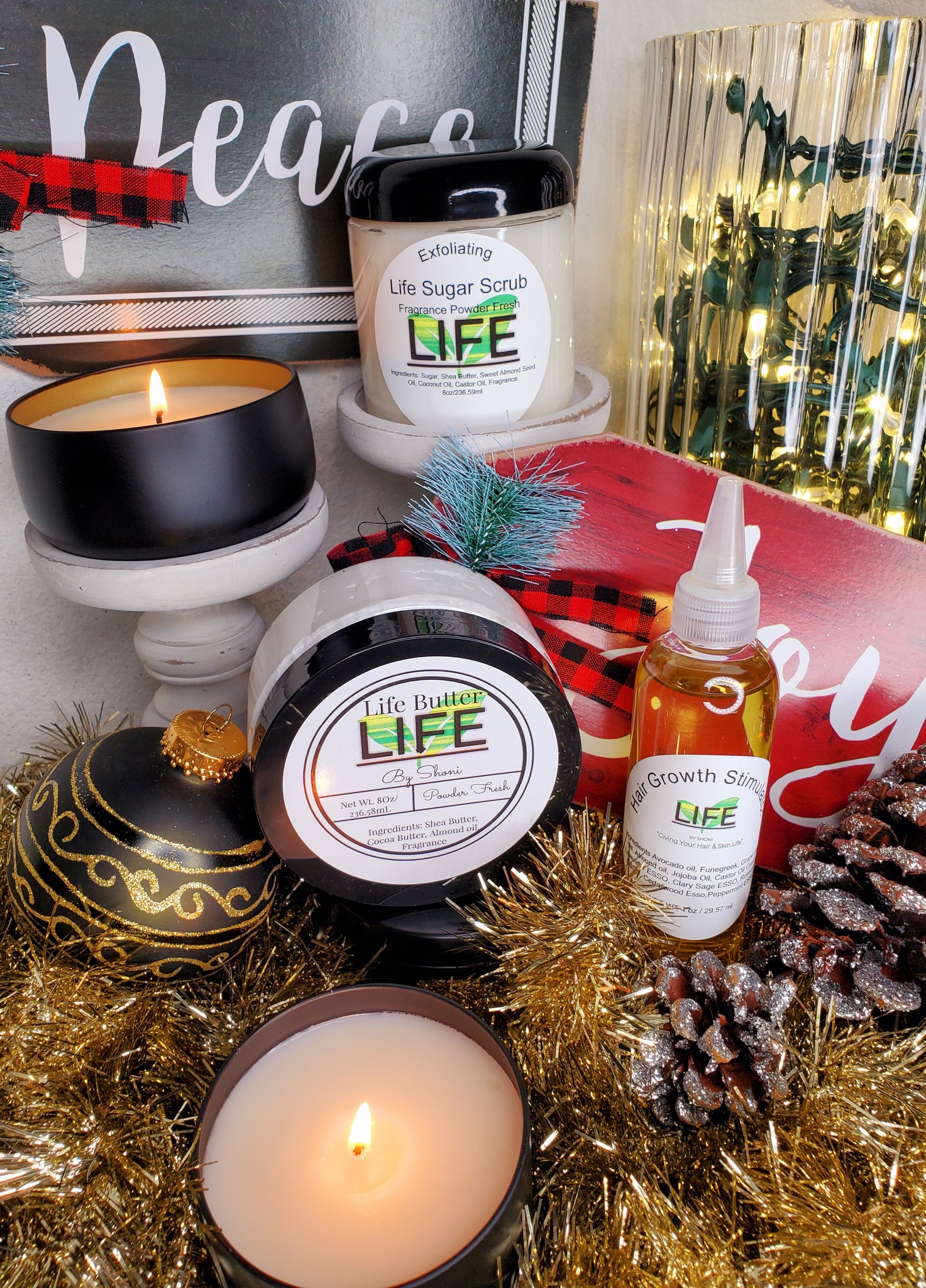 Option 2 Gift Set 1 8oz Sugar Scrub, 1 8oz LIFE Butter, 1 2oz Hair Growth Stimulator, 1 6.5oz Home LIFE candle (Simply enter your scent choice for each product in the notes of your order)